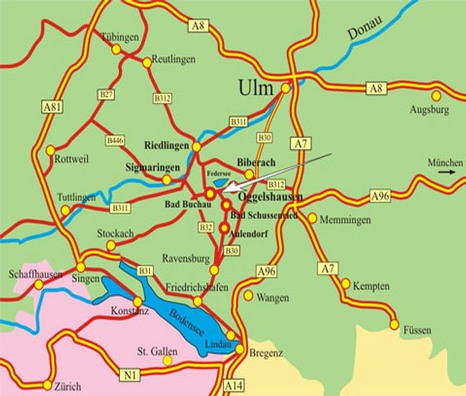 Autobahn Frankfurt/M. - Karlsruhe - Stuttgart - Ausfahrt Echterdingen. Über Reutlingen, Zwiefalten, Riedlingen/Donau nach Bad Buchau.
